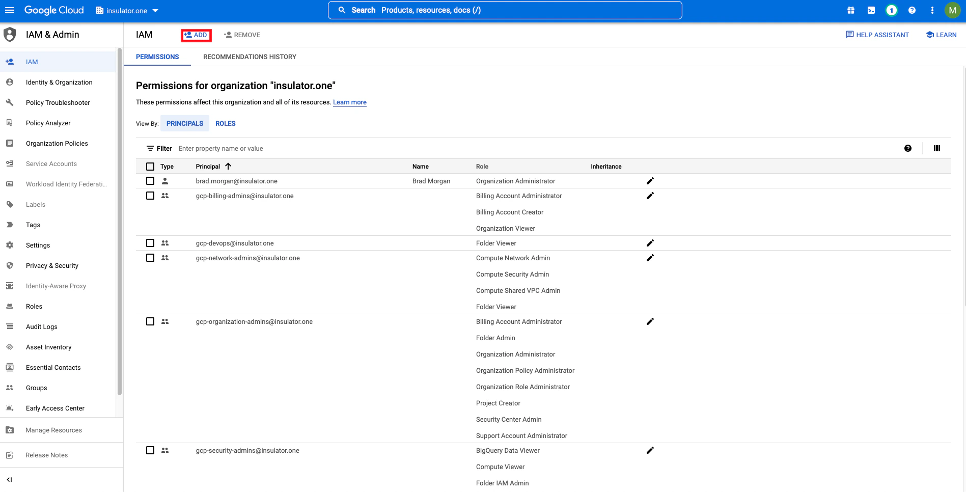 On the IAM page, find your Service Account in the list on the Principals tab.