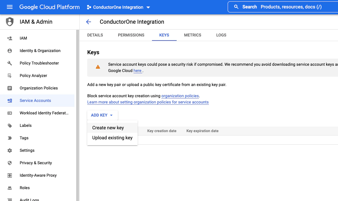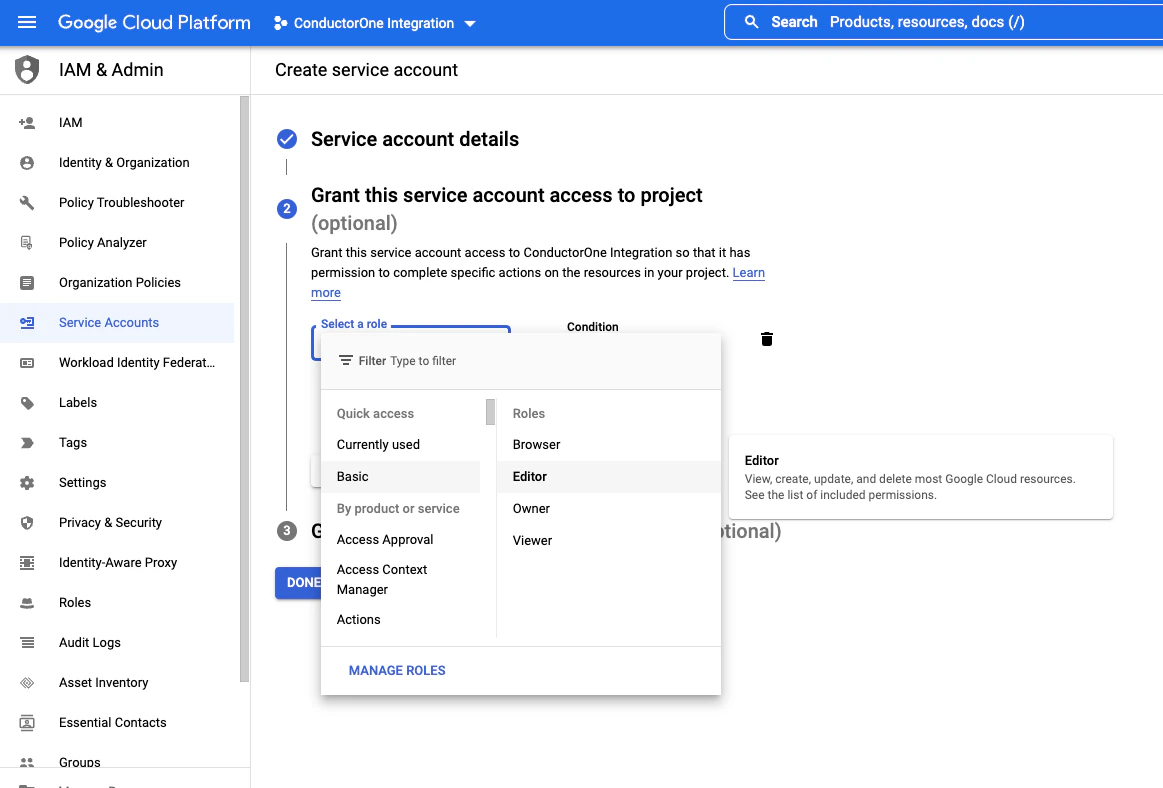 - Service account description: for example, “Service account for ConductorOne Google Workspace Integration”